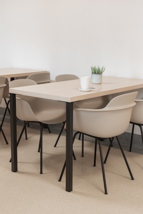 Visitors and staff enjoy a colourful environment in the cafeteria, furnished with Lottus 4L chairs and Lottus high barstools, Flat tables with central base and Sisto tables.